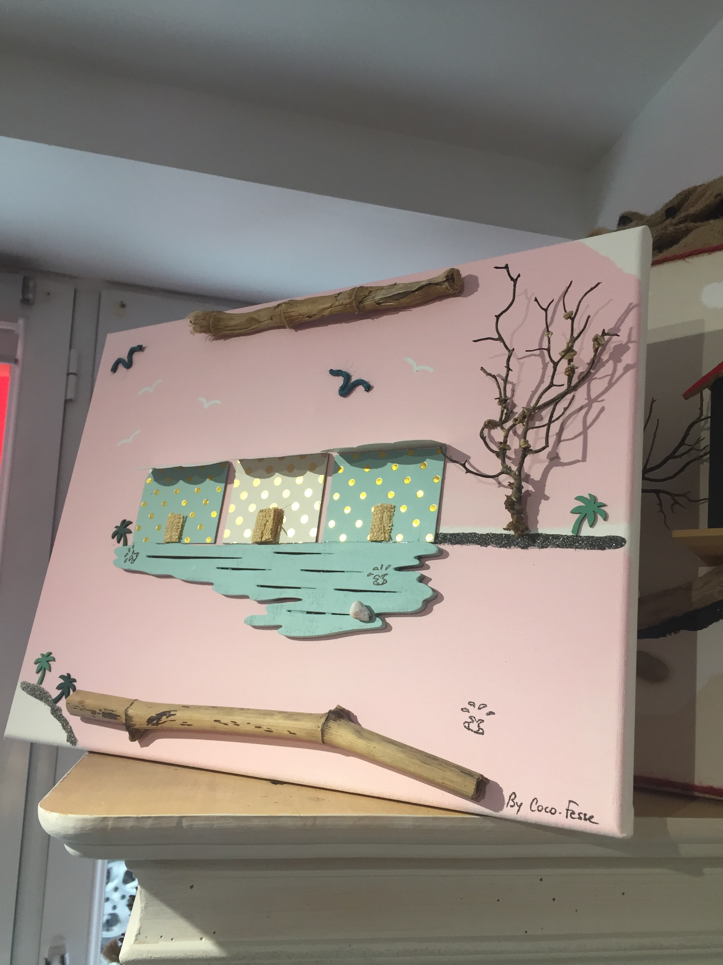 Toile 3 cabanes papier vert tendre et crème sur fond rose pâle au bord de l'eau. Gorgone et sable noir de Polynésie.
